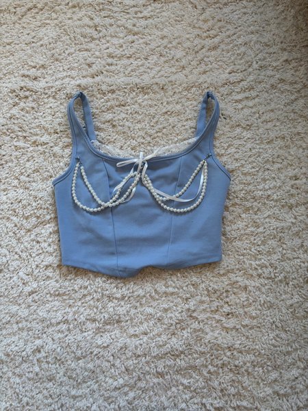 Blå topp med smala axelband och en rak nederkant. Toppen har vita pärlband som dekoration över bysten, fästa med små silverfärgade ringar. Mellan pärlbanden finns en liten vit rosett. Över bysten, under pärlbanden, finns en vit spetskant som ger en extra detalj till plagget.