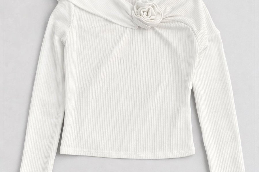 Vit, ribbad tröja med långa ärmar och en dekorativ rosett vid halsen. Tröjan har en speciell halsringning som ger en unik touch.