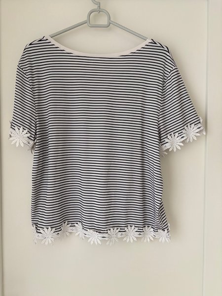 Svart- och vitrandig topp med korta ärmar. Toppen har en båthalsringning och är dekorerad med vita blomformade applikationer längs ärmslut och nederkant.