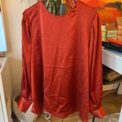 Röd tröja med lång ärm och en resårdetalj vid ärmsluten som ger en liten volangeffekt. Perfekt till någon av julaktiviteterna. Tröjan är helt ny med lapp kvar.