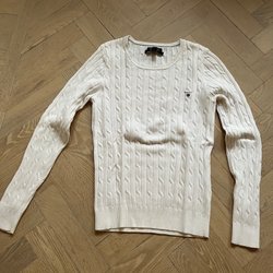Vit stickad tröja med flätmönster och dekorativa detaljer. Tröjan har en rund halsringning och långa ärmar. BOMULL.
