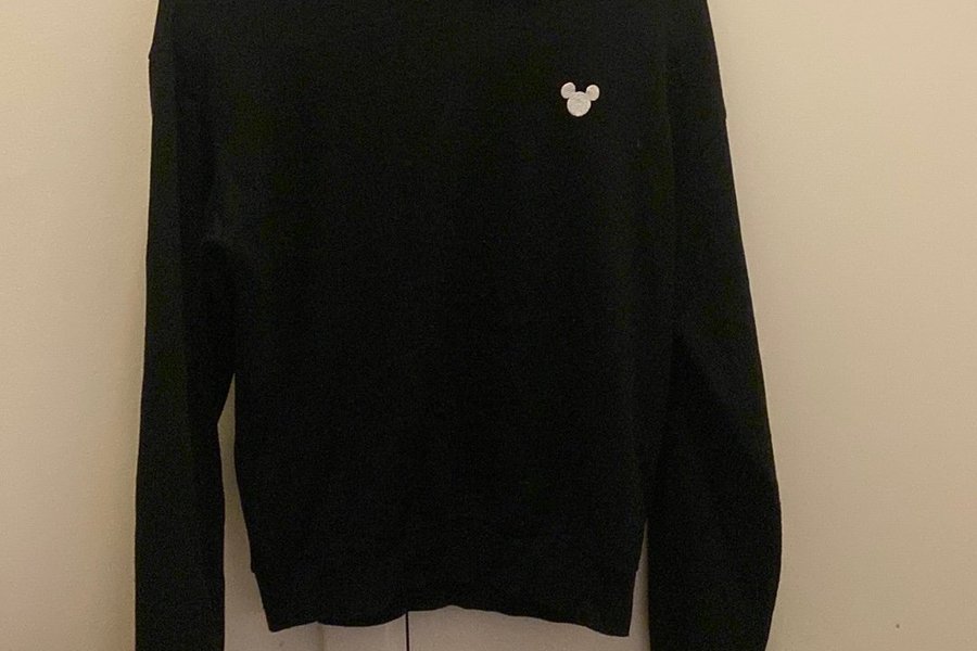 Svart tröja med långa ärmar och en liten vit Musse Pigg-logga på bröstet.