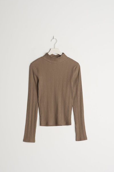 Brunfärgad, ribbstickad tröja med lång ärm och hög krage. Tröjan har en figurnära passform.