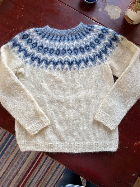 Tröja med rund halsringning och långa ärmar. Tröjan har ett mönsterstickat ok i två blå nyanser mot en ljus bottenfärg. Muddar finns vid ärmslut och nederkant. Ny oanvänd stickad av mig i mjukt skönt islandsgarn 100%ull ( Lettlopi)