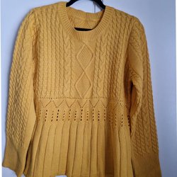 Gul stickad tröja med hög krage och ett diamantformat mönster framtill. Tröjan har långa ärmar och en ribbad nederkant.
