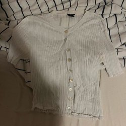 En kortärmad tröja i en ljus nyans. Tröjan har en öppen design framtill och långa ärmar med ribbade muddar. Den är stickad med ett mönster som ger textur.