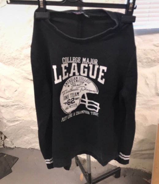 Svart tröja med tryck framtill. Trycket föreställer en amerikansk fotbollshjälm och texten ”College Major League”. Storleken på etiketten är L men det är S/M