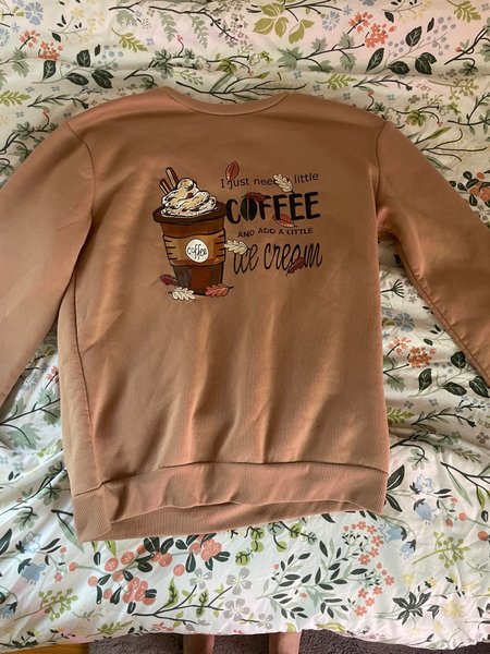 Tröja med rund halsringning och långa ärmar. Tröjan har ett tryck framtill med texten "I just need a little COFFEE and add a little ice cream" tillsammans med en bild på en kaffekopp med vispgrädde och lövdetaljer.