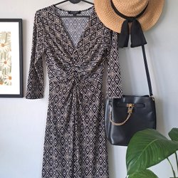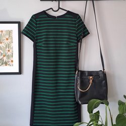 A light grey dress with a round neckline and short sleeves. The dress has a simple, straight silhouette and falls to about knee length.
