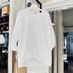 En vit tröja med en avslappnad passform och båthals. Ärmarna har en puffig effekt vid handlederna med resår. Tröjan har en ribbstickad detalj vid halsringningen och ärmsluten.