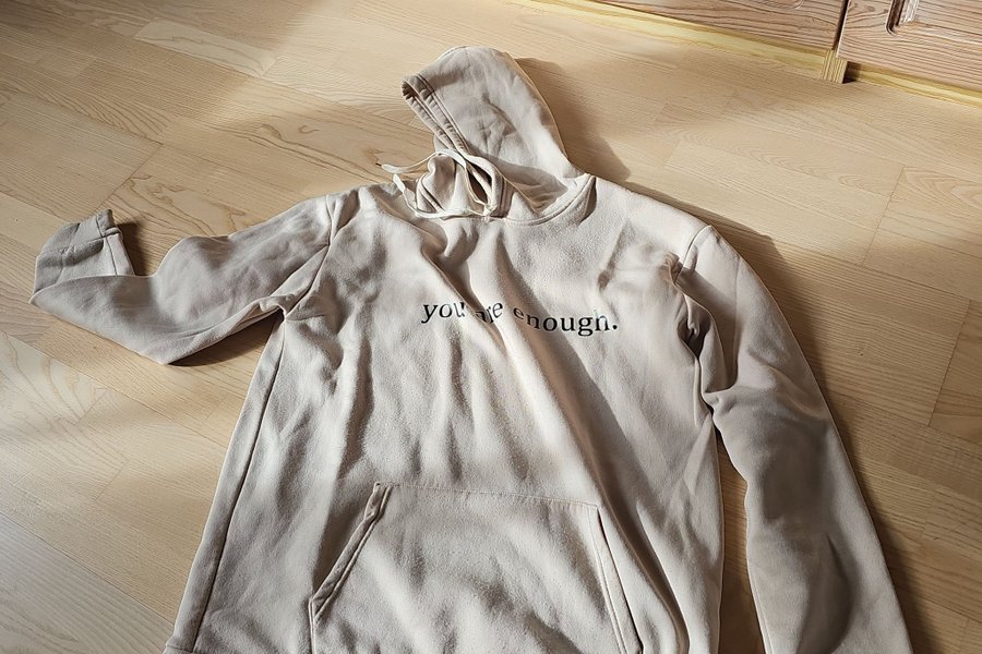 Ljusbeige huvtröja med texten "you are enough." tryckt på framsidan. Tröjan har en känguruficka framtill och muddar i ärmslut och nederkant.