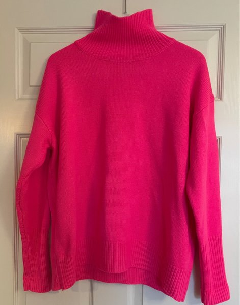 Tröja med hög krage i en rosa färg. Tröjan har långa ärmar med ribbade muddar och en ribbad nederkant. Passformen är avslappnad.