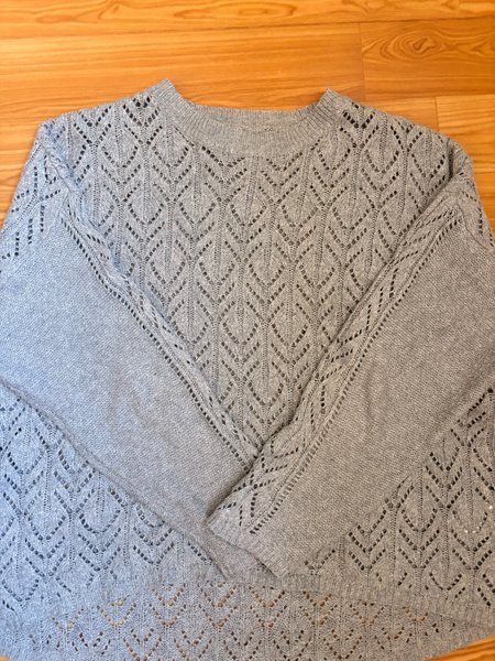 Tröja med långa ärmar och rund hals. Tröjan har ett genombrutet mönster över hela plagget, med undantag för ärmarnas insida som är slätstickad. Muddarna vid ärmslut och nederkant är ribbstickade.
