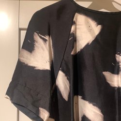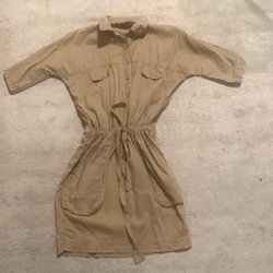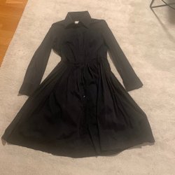 Vit skjorta med långa ärmar och en rundad nederkant. Längre bak än fram. Skjortan har en klassisk krage och knäpps framtill. Fickor.