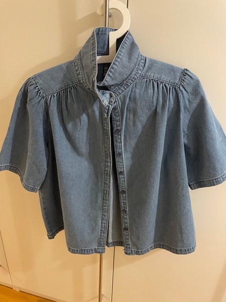 Denimblus med krage och knäppning framtill. Blusen har puffärmar och en avslappnad passform. Stl S, mycket bra skick, endast använd ett par gånger.