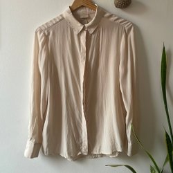 Beige skjorta med långa ärmar och knappar framtill. Krage och manschetter.