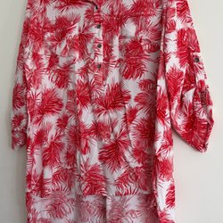 Blåvitrandig skjorta med trekvartsärmar och krage. Skjortan har knappar framtill och två bröstfickor. Ärmsluten har en knappdetalj.