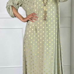 Grønne og hvide stribede bukser med elastik i taljen.