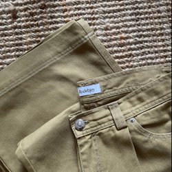 Byxor i mörkblå färg med guldiga detaljer.