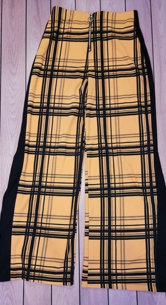Ett par utsvängda byxor med ett gult och svart rutmönster. Byxorna har en dragkedja framtill och en svart revär längs sidan. Slitsar nedtill. Mycket snygga. Behagliga och sköna med ett fint fall. Strl M.