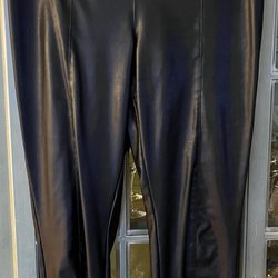 Dessa svarta byxor har en blank yta och en rynkad design längs benen. De är åtsittande och har en hög midja. Den blanka ytan ger en lackkänsla.
