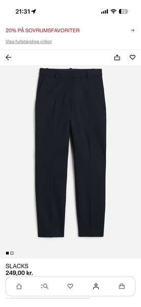 Marinblå kostymbyxor med pressveck framtill. Byxorna har en normalhög midja med hällor för skärp och fickor i sidorna. De stängs med dragkedja och knapp. Nypris 249 använda 1 gång