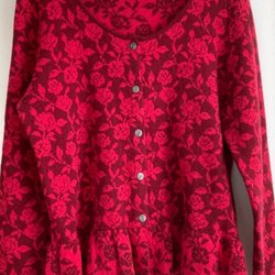 Klänning med ett livfullt mönster av tropiska fåglar, fjärilar och blommor i olika färger mot en mörk bakgrund. Klänningen har korta ärmar och en dragkedja baktill. Den är fodrad med ett rosa tyg som ger extra volym och fall.
