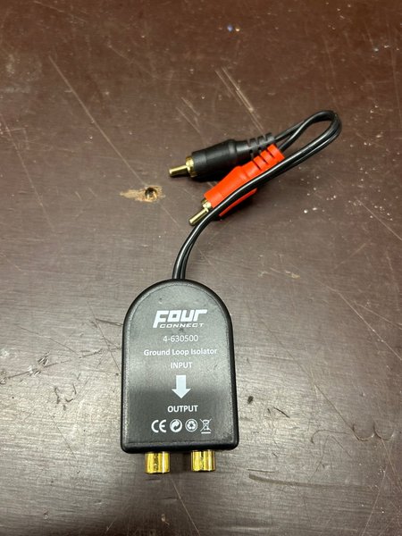 Four Connect Ground Loop Isolator, modell 4-630500. Denna enhet är designad för att eliminera jordbrus i ljudsystem. Den har RCA-ingångar och RCA-utgångar för enkel anslutning.