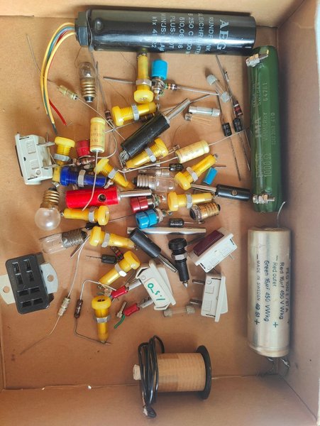 Diverse elektronik komponenter som kondensatorer, motstånd, lampor och annat. Se bilder för detaljer.