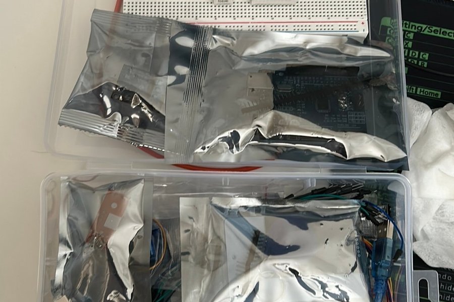 Elektronik komponenter i plastlådor. Innehåller bland annat breadboard, display, kablar och diverse elektroniska delar.