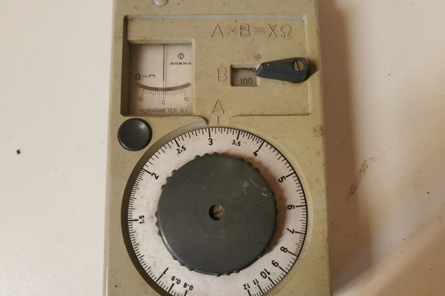 Normameter R1, en äldre modell av mätinstrument. Instrumentet har en display som visar "0-10" och en ratt märkt "A" med skalor från "0.8" till "12". En omkopplare märkt "B" visar värdet "100". Ovanför displayen står texten "A x B = X O".