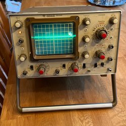 Enheten har en ratt för att justera frekvensen, samt kontroller för oscillator, slope och output. Baksidan visar anslutningar för strömförsörjning med valbara spänningsinställningar och en säkring.