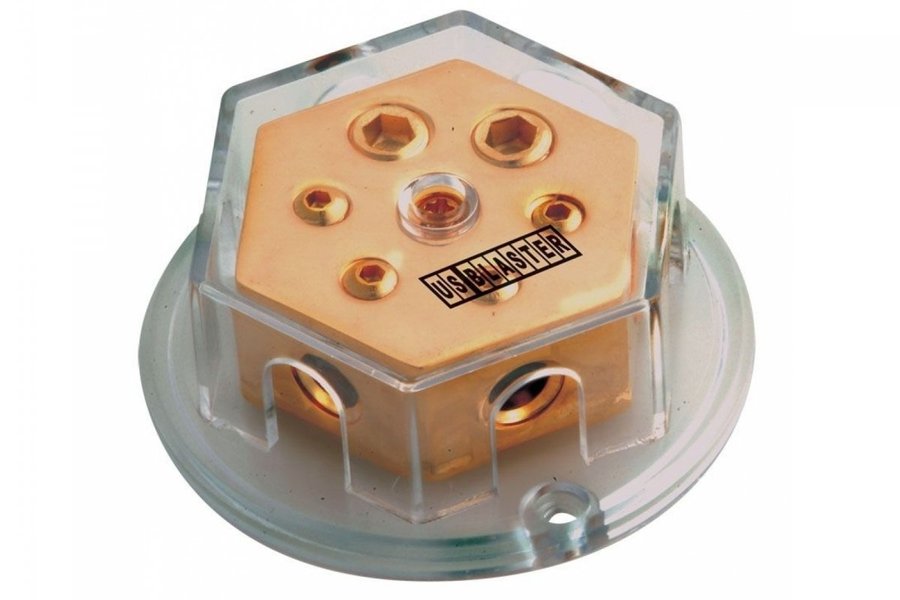 US Blaster USB 6103 Distribution BlockMed fast skydd: 4 ingångar / utgångar på 25,8 kvadrat mm, 2 ingångar / utgångar på 47,6 kvm mm, guldpläterad 24 karat för optimal strömfördelning.US Blaster