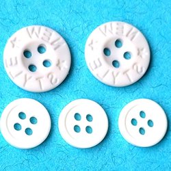 Sex stycken vita knappar med fyra hål. Varje knapp mäter ungefär 2,5 cm i diameter. I plast