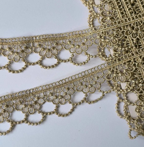 Guld/beige spets med lurex. 30 mm bred. Polyester, Lurex.