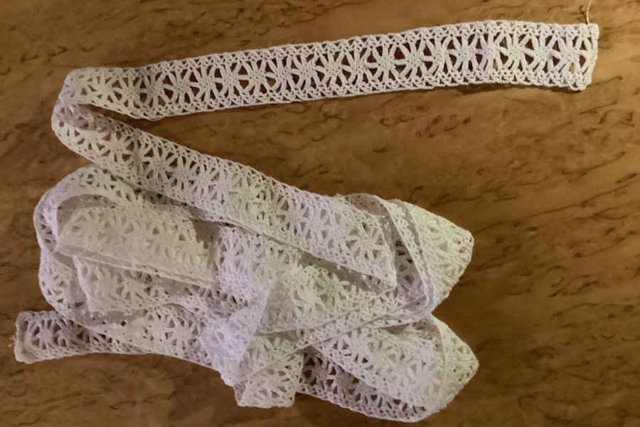 Vackert virkade band med ett intrikat hålmönster. Perfekt för att dekorera kläder, heminredning eller andra kreativa projekt. De är ca 145 cm och 410 cm långa och ca 3 cm breda. Spetsarna är ca 50 år gamla.