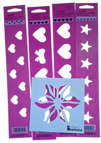 Schabloner med olika motiv. Innehåller hjärtan, stjärnor, rosetter och blomma.