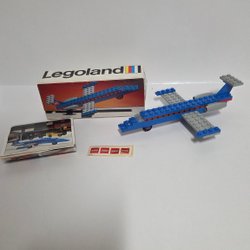 Lego flygplan i blått, vitt och orange. Kommer med ett svart ställ. Kan byggas om till båt och helikopter. Alla instruktionsböcker följer med, en av dem har flera vikta sidor men är hel. (Elden som ska sitta bak på flygplanet är borta)