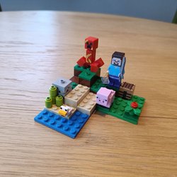 Ett LEGO Minecraft set med figurer som Steve, en zombie, en gris och en fågel. Inkluderar även en arbetsbänk och en blomma.