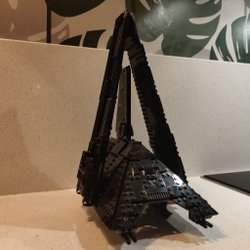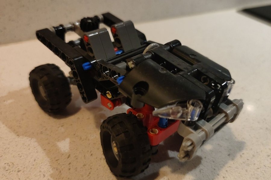 En LEGO Technic bil i svart och rött med fungerande hjul och detaljerade tekniska komponenter. Modellen har synliga växlar och axlar, samt en robust konstruktion som är typisk för Technic-serien.