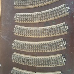 Detta set innehåller 6 böjda modelltågrälsar. Varje räls har en detaljerad design med svarta sliprar och grå ballast. Rälsskenorna är metallfärgade.