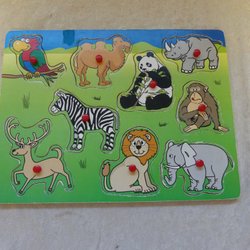 Träpussel med olika figurer som snigel, nyckelpiga, fjäril, trollslända, kyckling och flicka. Pusslet har knoppar för enklare hantering.