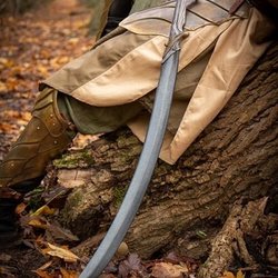 This bestselling Epic Armoury Elven Short Sword is a sleek curved blade with carved ornamentation. The sword is 60 cm long with a 40 m long single-edged and slightly curved blade. With a small round cross-guard above a 10 cm long oval-shaped handle, enjoy a comfortable and improved grip due to the additional split-leather wrap. The pommel is shaped to be as dangerous as the blade, with additional matching ornamentation.