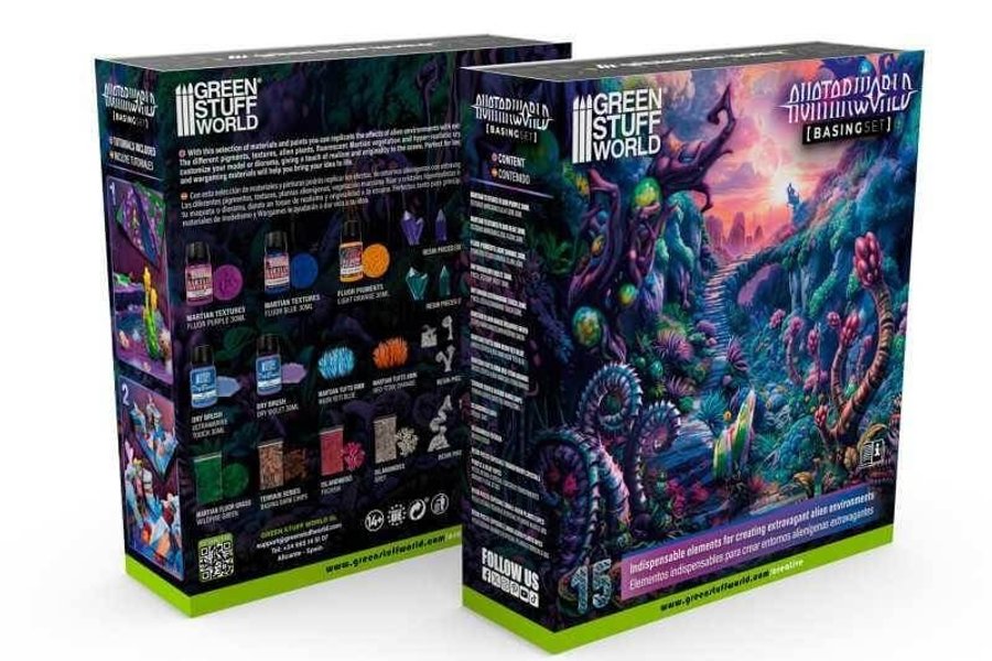 With this selection of materials and model paints you can replicate the effects of alien environments with extravagant Martian plants and strident colors. The different pigments, textures, alien plants, fluorescent Martian vegetation, and hyper-realistic crystals included in this basing set will allow you to customize your model or diorama, giving a touch of realism and originality to the scene. Perfect for beginners and hobbyists alike these modeling and wargaming materials will help you bring your idea to life.Contains:Martian Textures - Fluor Purple 30mlMartian Textures - Fluor Blue 30mlFluor Pigments - Light Orange 30mlDry Brush Paint - Ultramarine touch 30mlDry Brush Paint - Dry Violet 30mlMartian Tufts 6mm - Neon Yeti BlueMartian Tufts 6mm - Neo-Titan OrangeMartian Fluor Grass - Wildfire GreenBasing Bark ChipsIslandmoss - FuchsiaIslandmoss - GreyResin pieces