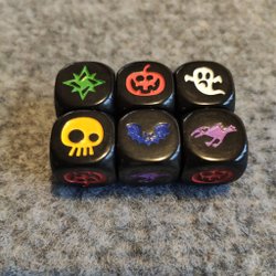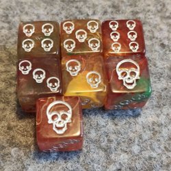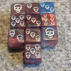 Ett set med sju tärningar i metall. Färgerna är koppar, lila och turkos. Perfekt för rollspel.