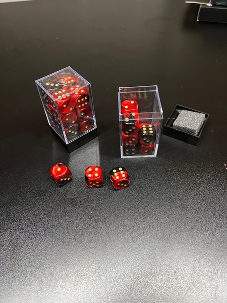 Ett set med 24st tärningar i förvaringslådor.