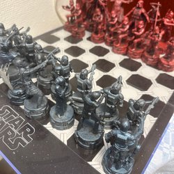 Ett schackspel med 32 schackpjäser i svart och vitt. Schackbrädet är hopfällbart och mäter 30.48 x 30.48 cm.