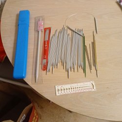 Stickor i storlekar: 5, 4½, 4, 3½, 3, 2½. Vidare 6 olika stickor med spets i bägge änderna.