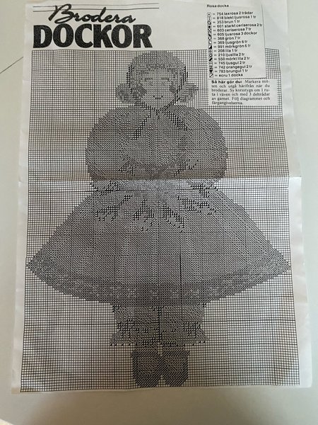 Broderimönster för dockor. Mönstret är för korsstygn och visar en docka i rosa nyanser. Instruktioner för färg och trådantal medföljer.