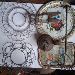 Fint broderad garnhållarpåse, garnhållare i lackarbete antik, nålkudde i hantverk, garnnysta, "trästopp" samt över 40 stickor.